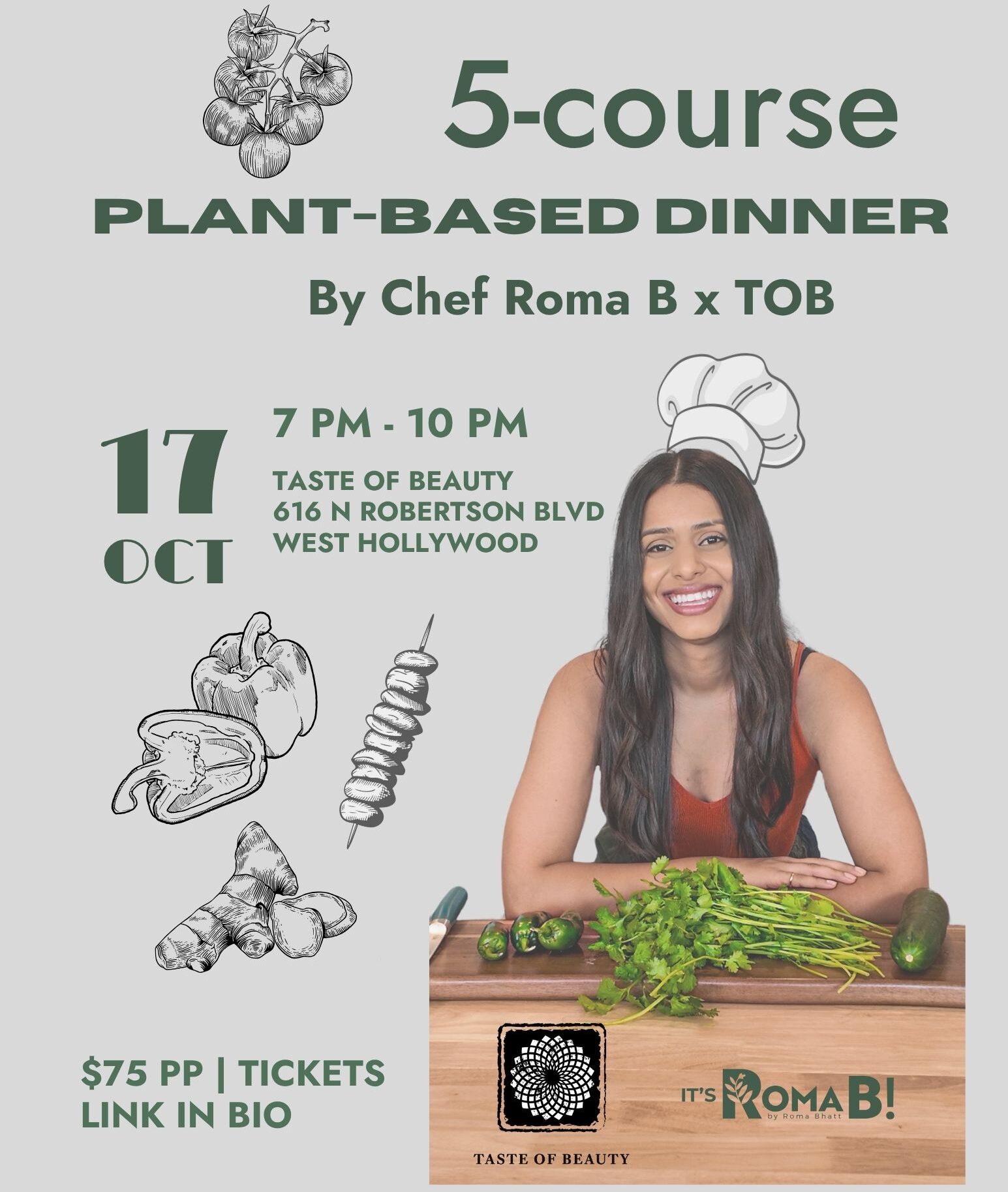 Join Chef Roma B for her debut plant-based dinner event—a one-night-only culinary collaboration with West Hollywood’s renowned Taste of Beauty.