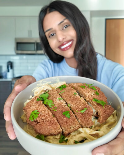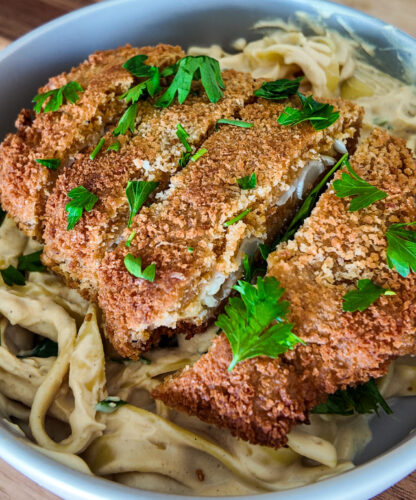 A plant-based comfort meal — creamy, crispy, flavorful, and completely dairy-free. Pan-fried cauliflower steaks are seasoned with bold Cajun spices, then served over a creamy Alfredo sauce made from silken tofu, roasted cauliflower, and plant-based milk. Whether you’re craving vegan chicken Alfredo or just want a cozy weeknight dinner, this dish delivers all the indulgence without the heaviness. Ready in under an hour and perfect for meal prep or sharing.