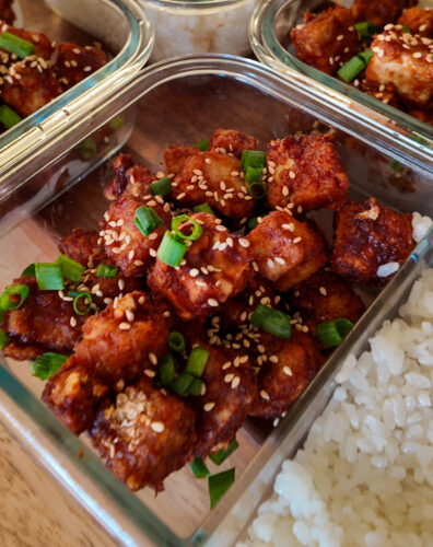 This Korean Popcorn Tofu is the ultimate high-protein, plant-based meal prep you’ll actually look forward to eating all week (I know I do). Crispy tofu bites are coated in a sweet and spicy gochujang glaze and served over fluffy sweet sticky rice for a satisfying balance of flavor and texture. Each serving packs around 40g of protein, making it perfect for fueling your day while staying 100% vegan and dairy-free. It’s easy to make, meal-prep friendly, and easy to reheat.